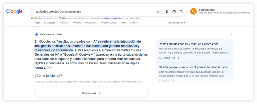 La función conocida como vista creada con IA (AI Overviews) aparece en la parte superior de la página de resultados de Google. Es un bloque destacado que resume la información más relevante sobre la consulta realizada. Este bloque se genera automáticamente y está alimentado por IA generativa, lo que permite dar respuestas completas sin necesidad de hacer clic en los resultados orgánicos.