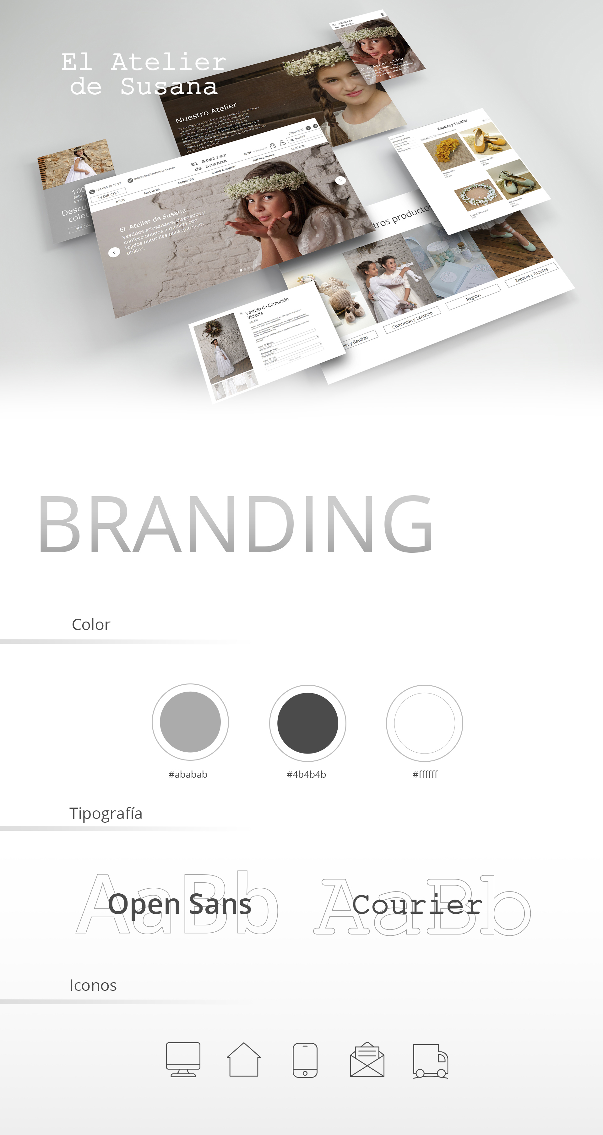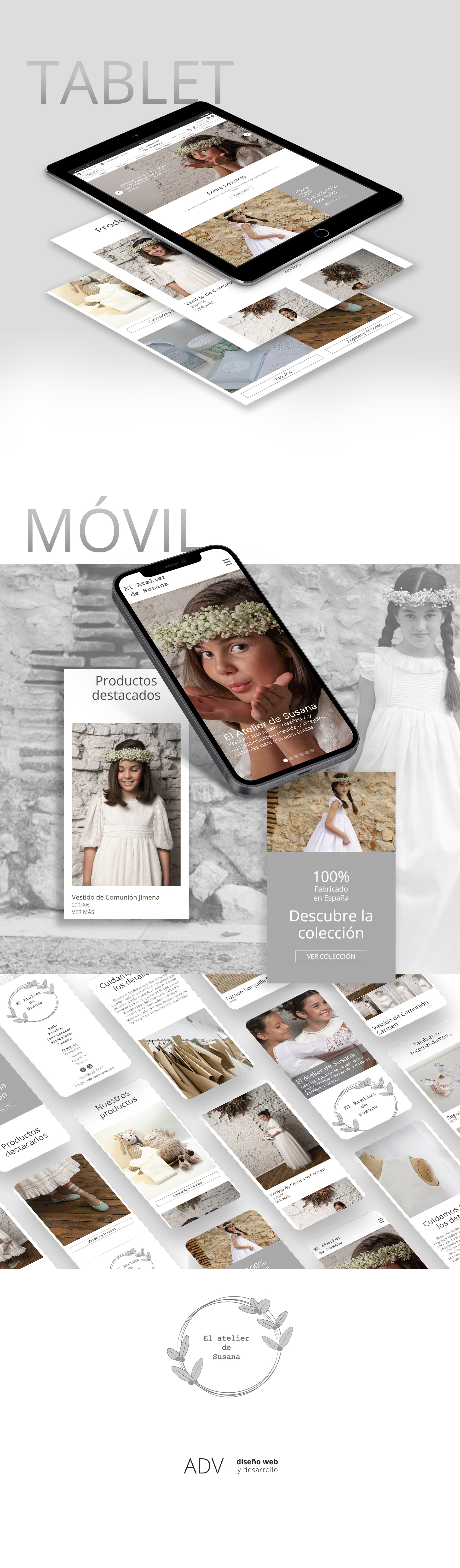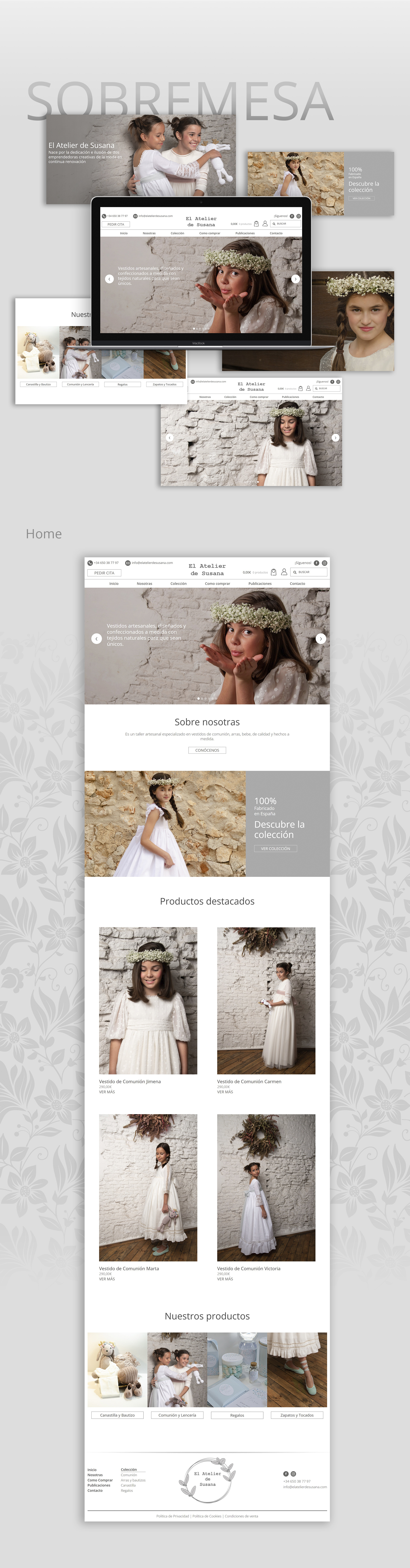 Ecommerce para empresa especializada en vestidos de comunión para niña. Web eminentemente blanca para darle el máximo protagonismo al producto. Fotografías de gran tamaño y fichas de producto desde las que se puede configurar el vestido.